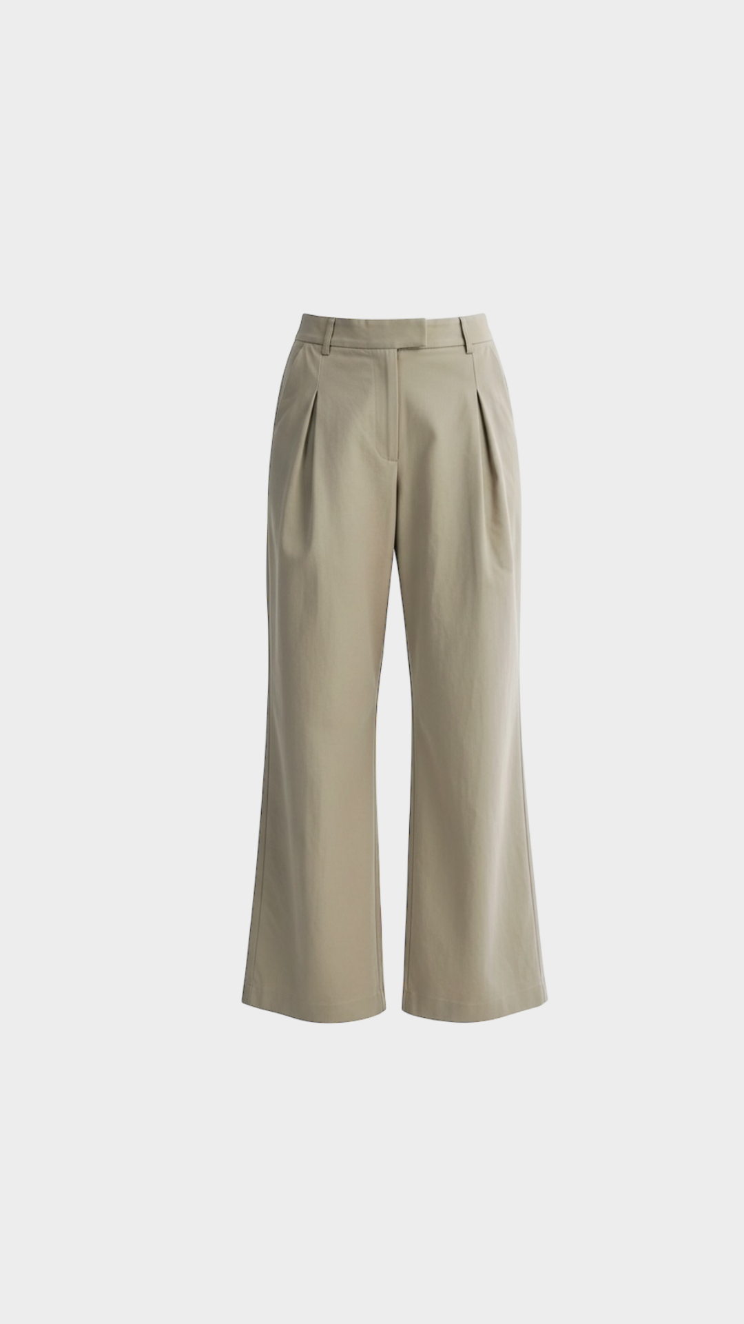 Pantalón de pierna ancha en color verde olivo con pinzas frontales y bolsas laterales.