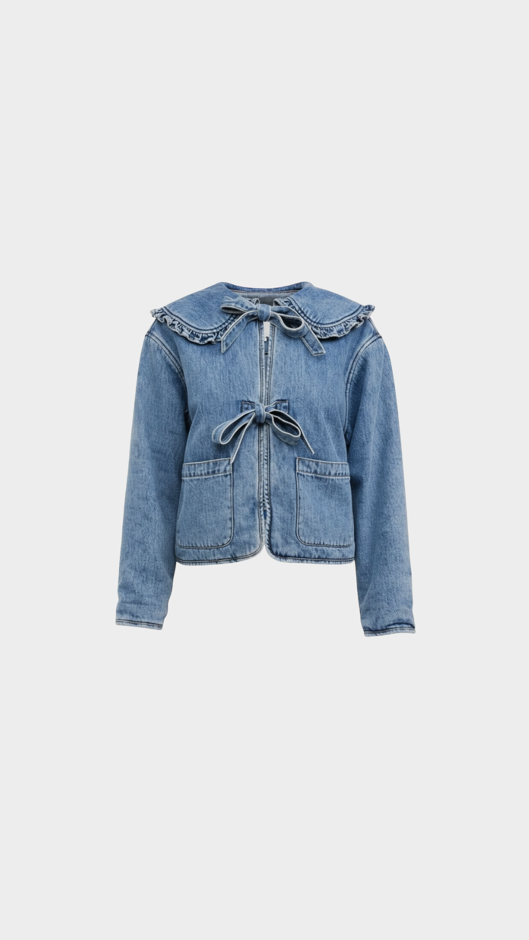 Chamarra de mezclilla confeccionada en tejido de algodón y acolchada; cuello bobo, bolsas delanteras y cintillas al frente.