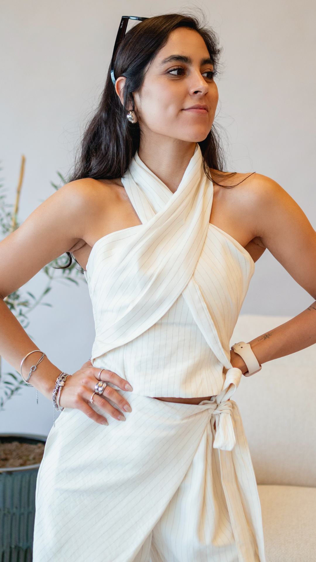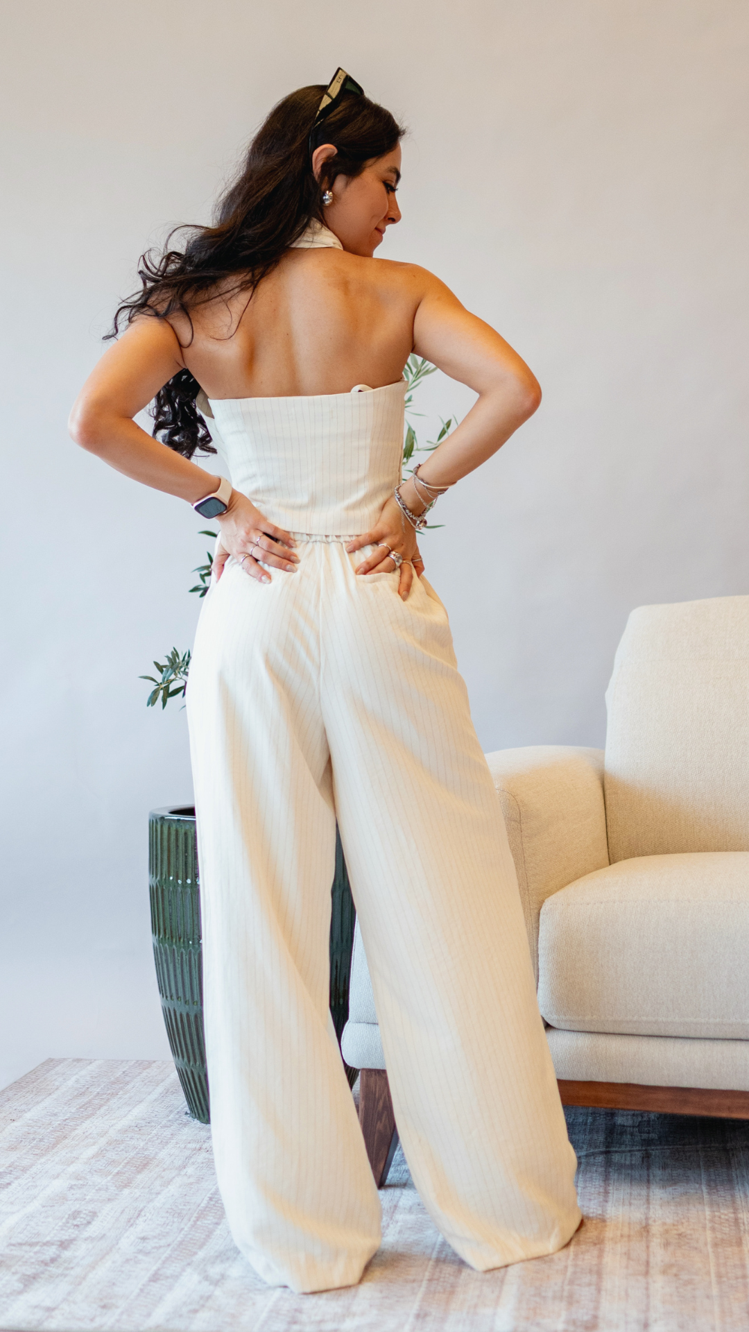 Set de 2 piezas en top y pantalón en color crema con ligeras rayas, top cuello halter y con zipper a un costado; pantalón de cintura cruzada con tiras que se ajustan y resorte en parte trasera.
