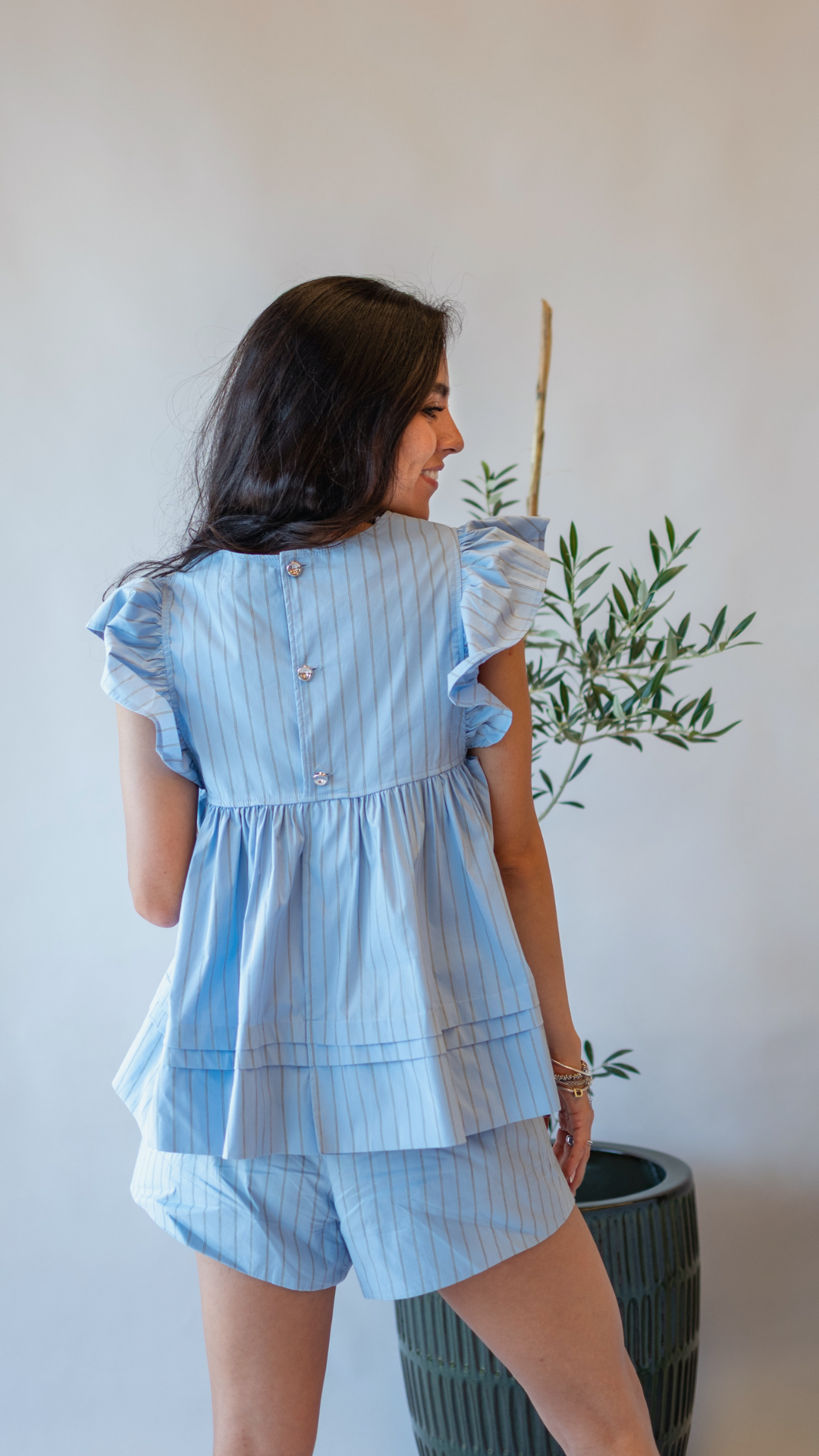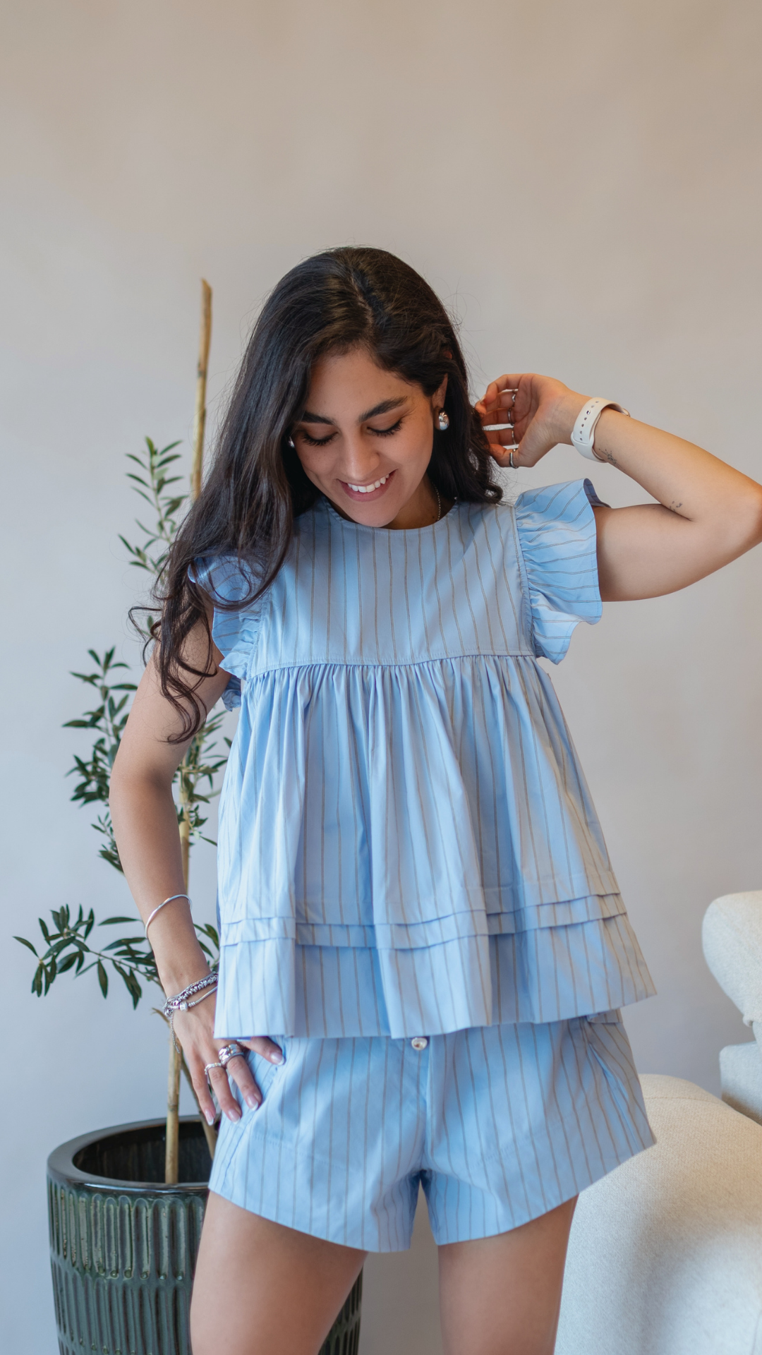 Set de 2 piezas, top con manga tipo mariposa y short con resorte en cintura ,bolsas a los costados y ambos confeccionados principalmente en tela de algodón.