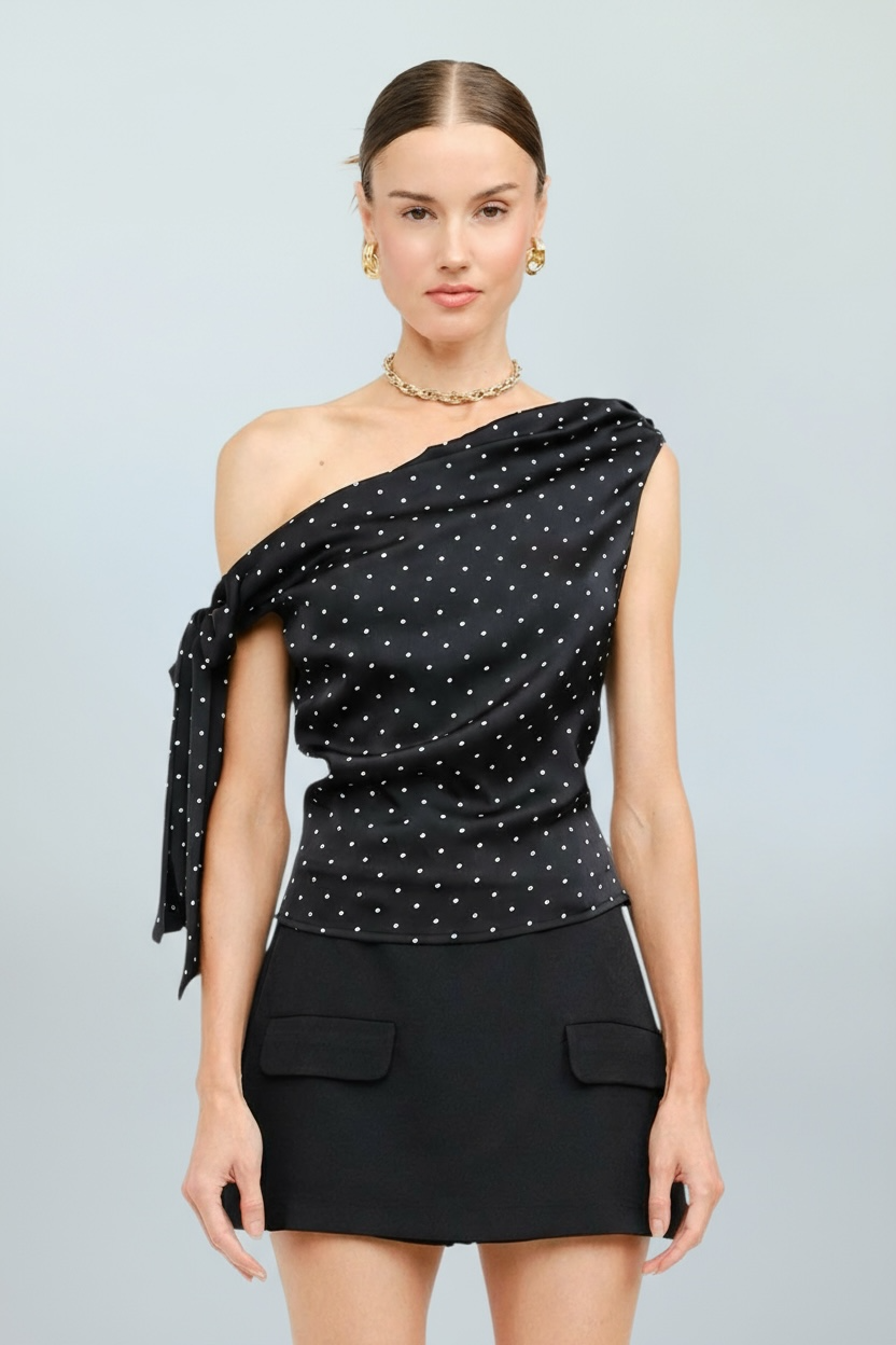 Top a un solo hombro con drapeado, cinta ajustable en brazo y cierre lateral; confeccionado en tela satinada.