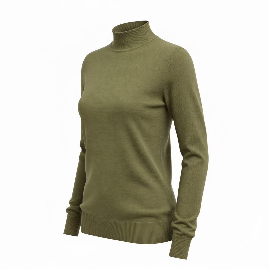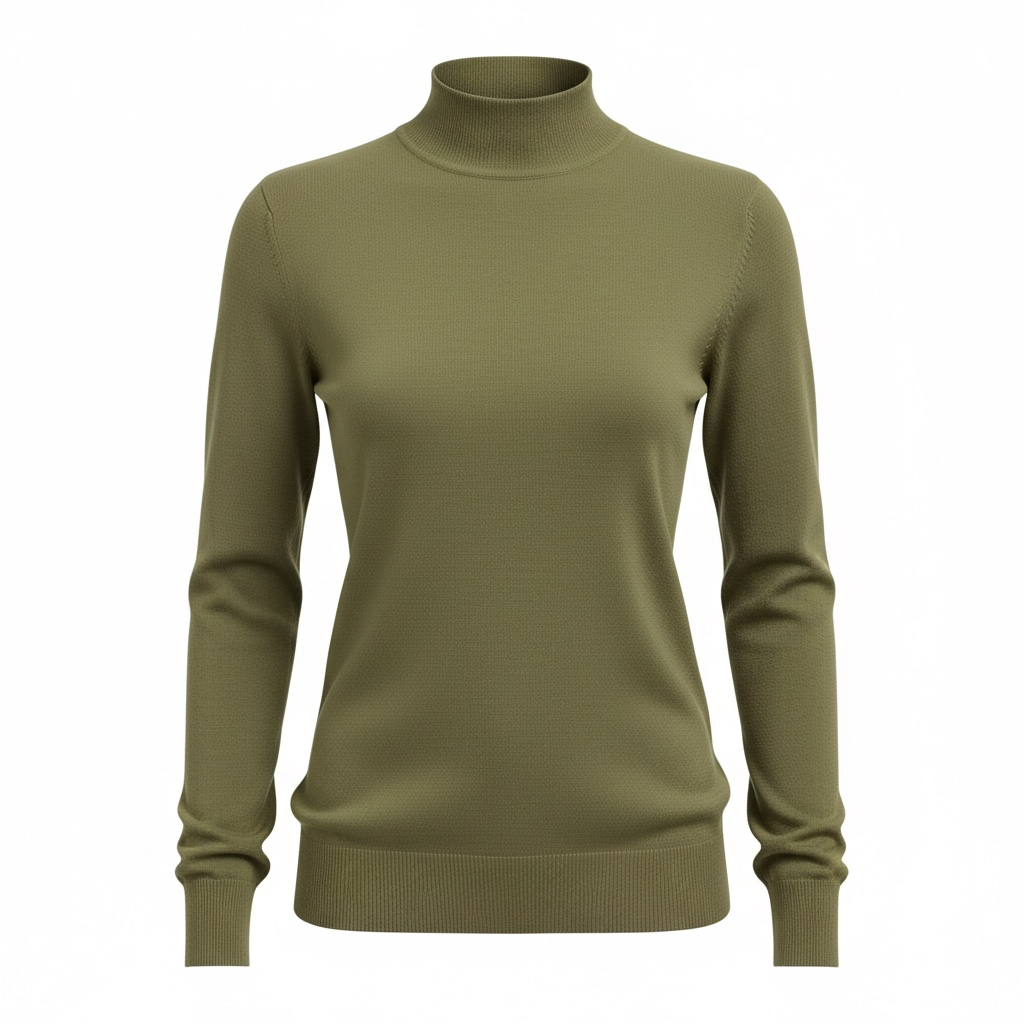 Suéter de cuello alto, confeccionado en un tejido suave y de punto fino con diseño liso en color verde olivo, bordes, cuello y puños acanalados.
