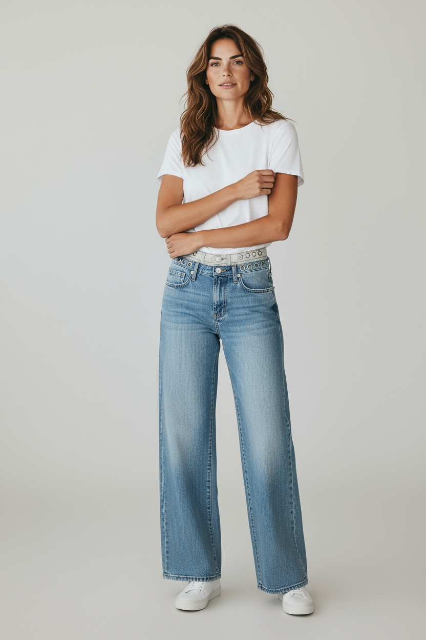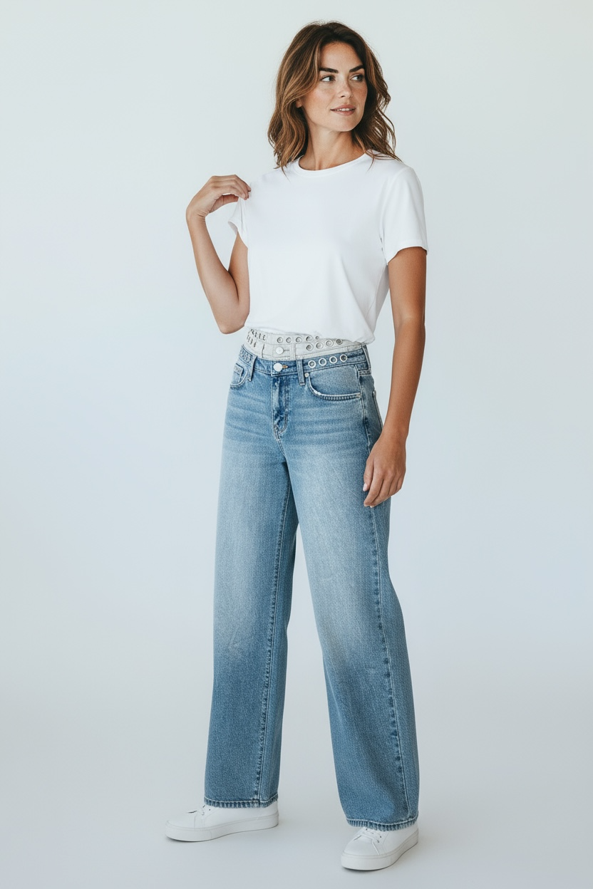Jeans de tiro alto con argollas en la cintura y doble cintura, bolsillos al frente y atrás. Confeccionado en tela 100% algodón.